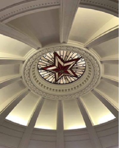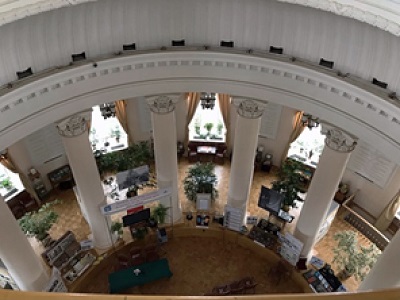 Рис.1 Группа 4 курса кафедры рационального природопользования Отдельная часть музея – великолепный колонный зал - Ротонда, занимающий 31 и 32 этажи. В Ротонде представлена постоянная экспозиция об истории Московского университета и строительстве высотки на Воробьёвых горах, а также проводятся временные выставки. Вся экспозиция богато проиллюстрирована художественными произведениями, скульптурными портретами видных ученых-естествоиспытателей, живописными полотнами, барельефами, историческими снимками. Поражает масштаб рубиновой звезды в куполе Ротонды, сделанной из того же стекла, что и звезды на башнях Кремля (рис. 2).
