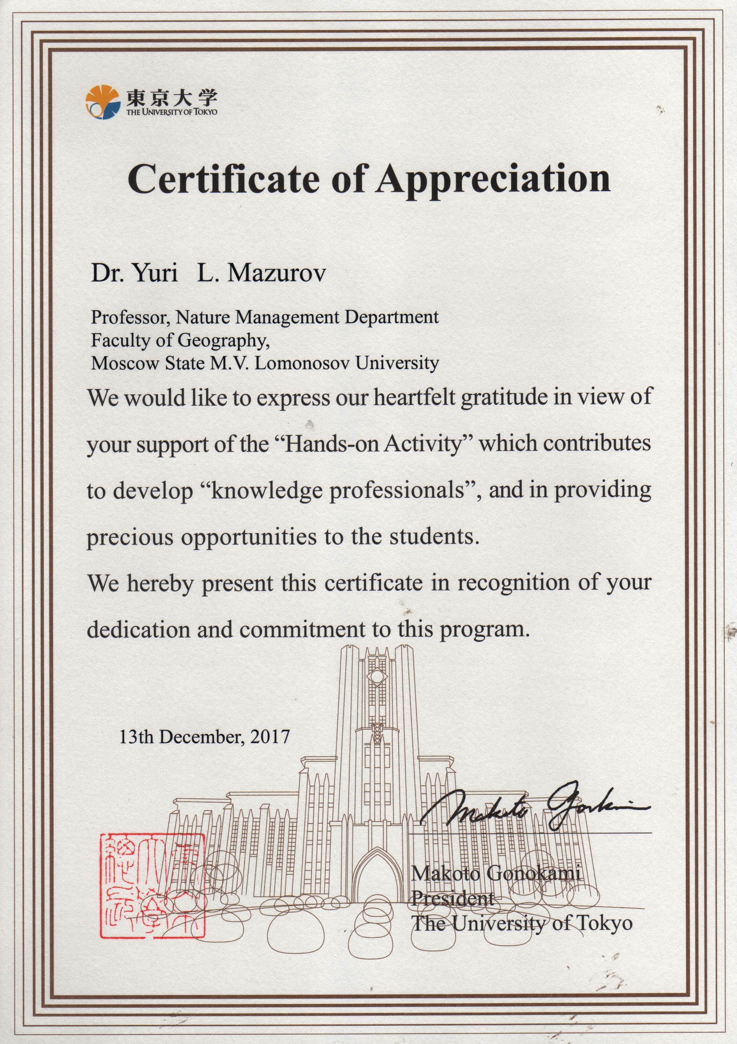 Выражение признательности от Токийского университета![]() Кафедрой рационального природопользования (РПП) получен сертификат (Certificate of Appreciation) Токийского университета (ТУ) с выражением признательности за поддержку программы «Знания как наследие» в рамках деятельности по формированию профессиональной компетентности студентов. Сертификат подписан 13 декабря 2017 г. президентом ТУ г-ном Макото Гонотами (Makoto Gonotami). В сопроводительном письме руководителя названной выше программы г-на Нобуа Токеда (Nobua Tokeda) в более развернутой форме указывается на позитивные последствия сотрудничества наших университетов и выражается надежда на продолжение этого сотрудничества в будущем. Полученные из Токийского университета документы стали несомненным признанием эффективности сотрудничества кафедры РПП с рядом профильных подразделений ведущего в Японии вуза, стартовавшего по нашей инициативе пять лет тому назад. Подписав тогда в Токио Меморандум о взаимопонимании (24.01.2013), кафедра в полной мере воспользовалась потенциалом подписанного ранее договора о сотрудничестве между МГУ и ТУ. Сейчас в развитие названных соглашений ведется сотрудничество по целому ряду направлений: семинары по устойчивости среды, совместные сборники научных трудов, обмен стажерами. Мы принимаем группы студентов из Токийского университета для краткосрочного знакомства с университетами России в летний период, осуществляем консультирование по курсовым и дипломным работам и т.п. Сейчас в программе стажировок в ТУ помимо геофака участвует еще четыре факультета МГУ. Координацией сотрудничества с коллегами из Токийского университета занимается ответственный за международное сотрудничество на кафедре РПП проф. Ю.Л. Мазуров, находящийся в постоянном контакте по этому вопросу с администрацией факультета и соответствующими структурами ректората МГУ. В ответ на пожелания Токийского университета и в соответствии с нашими планами кафедра намерена продолжить это взаимовыгодное сотрудничество в 2018-м и в последующие годы. Есть основания надеяться, что при поддержке факультета и ректората МГУ оно принесет нашей кафедре новые позитивные результаты. Соб. инф. |