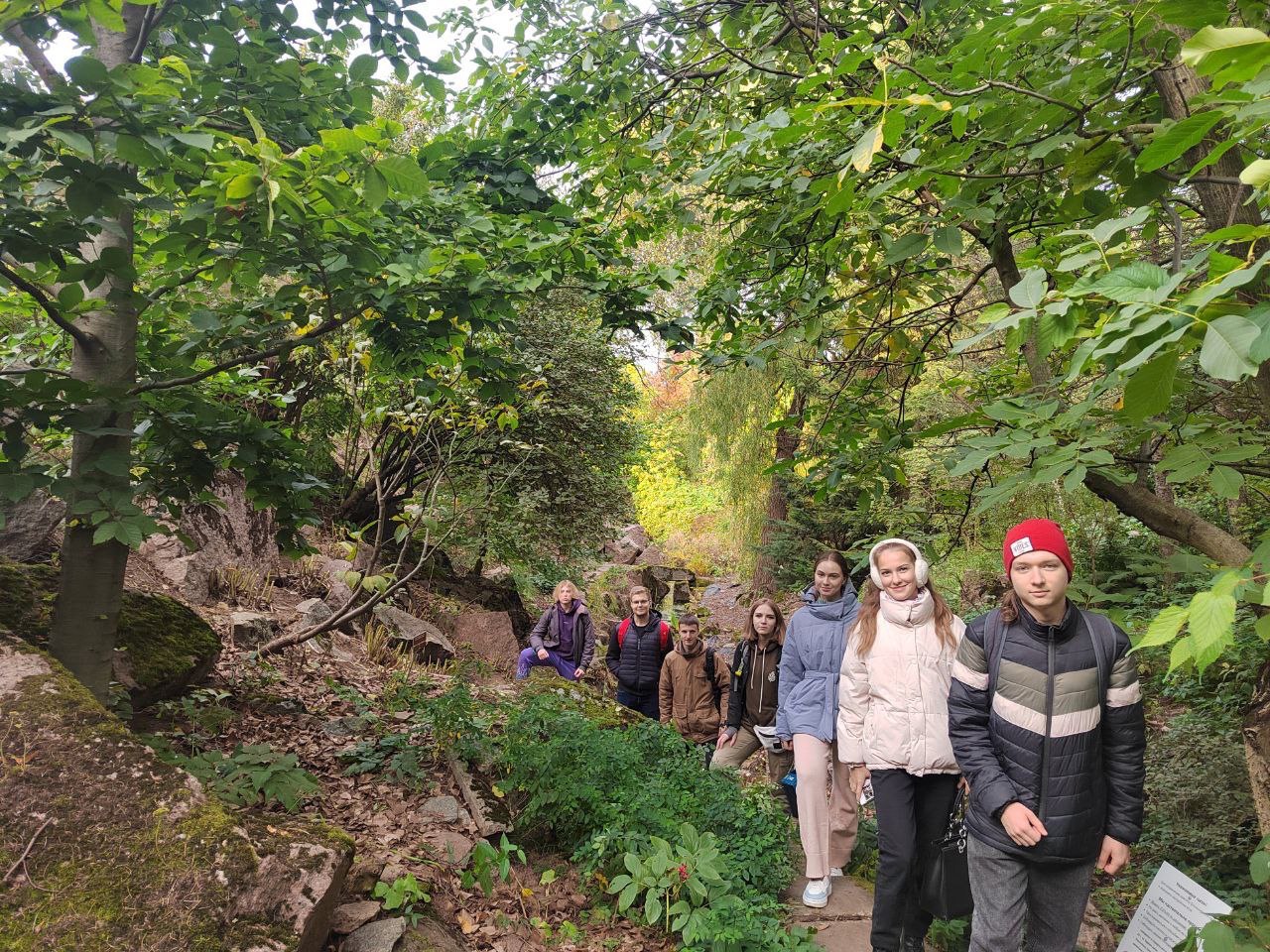 В ходе занятия учебная группа также посетила Альпинарий с коллекциями растений различных природных зон. Обширность территории обитания растений, собранных в Ботаническом саду, поражает воображение. Здесь представлены знакомые нам по летней полевой практике карликовые берёзы и арктоус альпийский из тундр Европейского Севера России; бешеный огурец, можжевельник казацкий и трахистемон восточный, растущие в Крыму; элеутерококки и дальневосточные рододендроны – аборигены Дальнего Востока и многое другое. Не менее интересными оказался огород Ботанического сада с его тыквами впечатляющего размера и интересной формы, обусловленной изменением увлажнения в течение роста. Конечно, мы не смогли пройти стороной мимо красивых цветочных клумб – «визитной карточки» Ботанического сада.